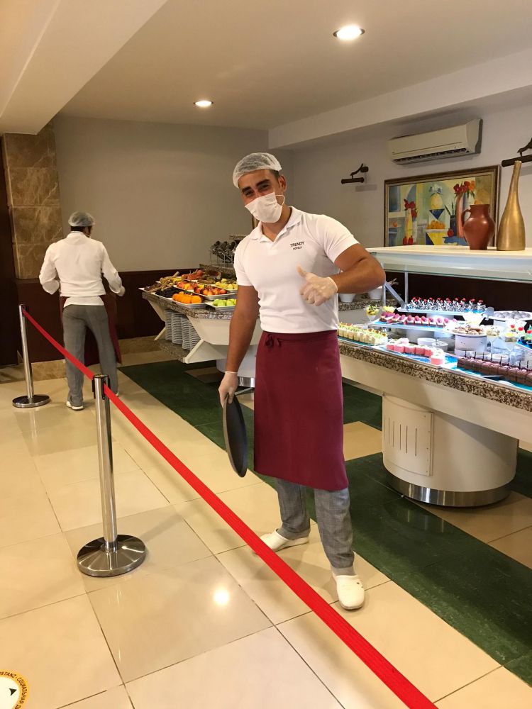 Nun zum Hotel. Das ganze Personal, vom Gärtner bis zur Leitung, trägt den ganzen Tag Masken, so dass sich die Gäste ohne Schutzmasken im Hotel frei bewegen können. Die Schutzmassnahmen lassen nichts zu wünschen übrig. Im ganzen Hotel sind Desinfektionsspender aufgestellt die in keinem einzigen Fall leer waren. Das Essen ist in gleicher Auswahl wie eh und je vorhanden, aber in dieser Zeit wird einem durch die Köche geschöpft und dabei werden immer die Sicherheitsabstände eingehalten. Die Tische werden nach jedem Gast desinfiziert und mit neuen Sets und eingepacktem Besteck vorbereitet.