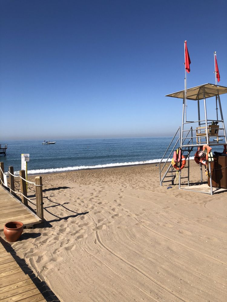 Strand: Sand wie Puderzucker, da stört einem das Seegras wenig, das im Wasser angespült wird. Liegestühle waren zahlreich vorhanden, das gab es immer Platz in den vorderen Reihen.